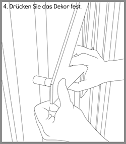 4. Setzen Sie die Abstandshalter in die Gewinde und drücken Sie das Dekor fest. Falls Sie entdecken dass die Löcher etwas abweichen können Sie die Abstandshalter-Füße etwas lösen indem Sie sie etwas losschrauben. Das erleichtert es das Dekor anzudrücken dass trotz allem stabil an der Fassade sitzen wird. Achtung! „Schlagen“ Sie nicht auf das Dekor da Schläge das Kunststoffmaterial beschädigen können oder im schlimmsten Fall die Abstandshalter abbrechen könnten. Falls Die Bohrungen korrekt ausgeführt wurden muss das Dekor sich ganz einfach in die Abstandshalter-Füße einfügen. |