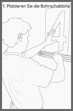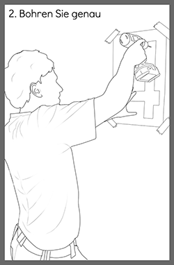 1. Mit jedem Produkt erhalten Sie eine passende Bohrschablone welche Sie vor dem Bohren z.B. mit Kreppband an der Fassade befestigen. Bitte verwenden Sie eine Wasserwaage zum ausrichten. Siehe Bild. |